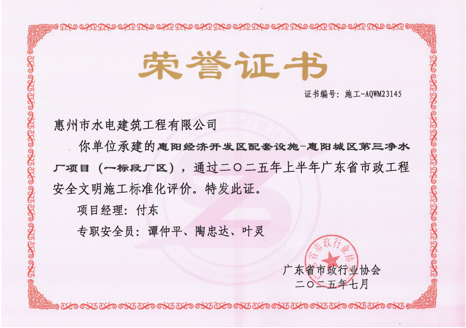 近日,廣東省市政行業(yè)協(xié)會傳來喜訊,由我司承建的惠陽經(jīng)濟(jì)開發(fā)區(qū)配套設(shè)施—惠陽城區(qū)第三凈水廠項(xiàng)目(一標(biāo)段廠區(qū)),順利通過2025年上半年“廣東省市政工程安全文明施工標(biāo)準(zhǔn)化”評價(jià)。……